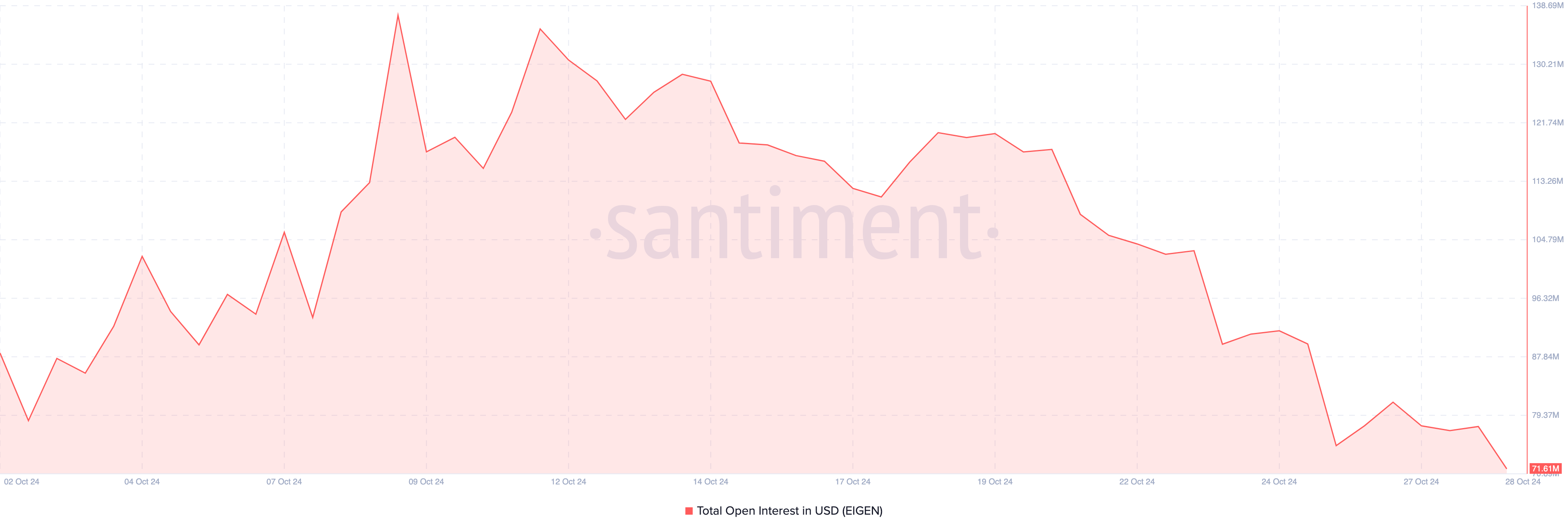 Derimot, når Open Interest faller betydelig, som sett med EigenLayers OI som nå er på et historisk lavt nivå på $ 71,81 millioner, kan det indikere avtagende interesse fra tradere og mangel på ny kapital som kommer inn i markedet.