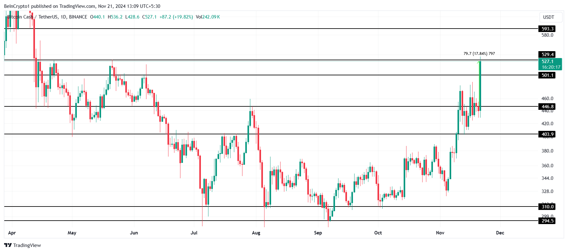 Den nylige oppgangen har løftet BCH til et syv måneders høydepunkt, og plassert den nær motstandsnivået på $ 529. Dette nøkkelnivået har ikke blitt brutt siden midten av april, noe som gjør det til et avgjørende mål for vedvarende bullish momentum.