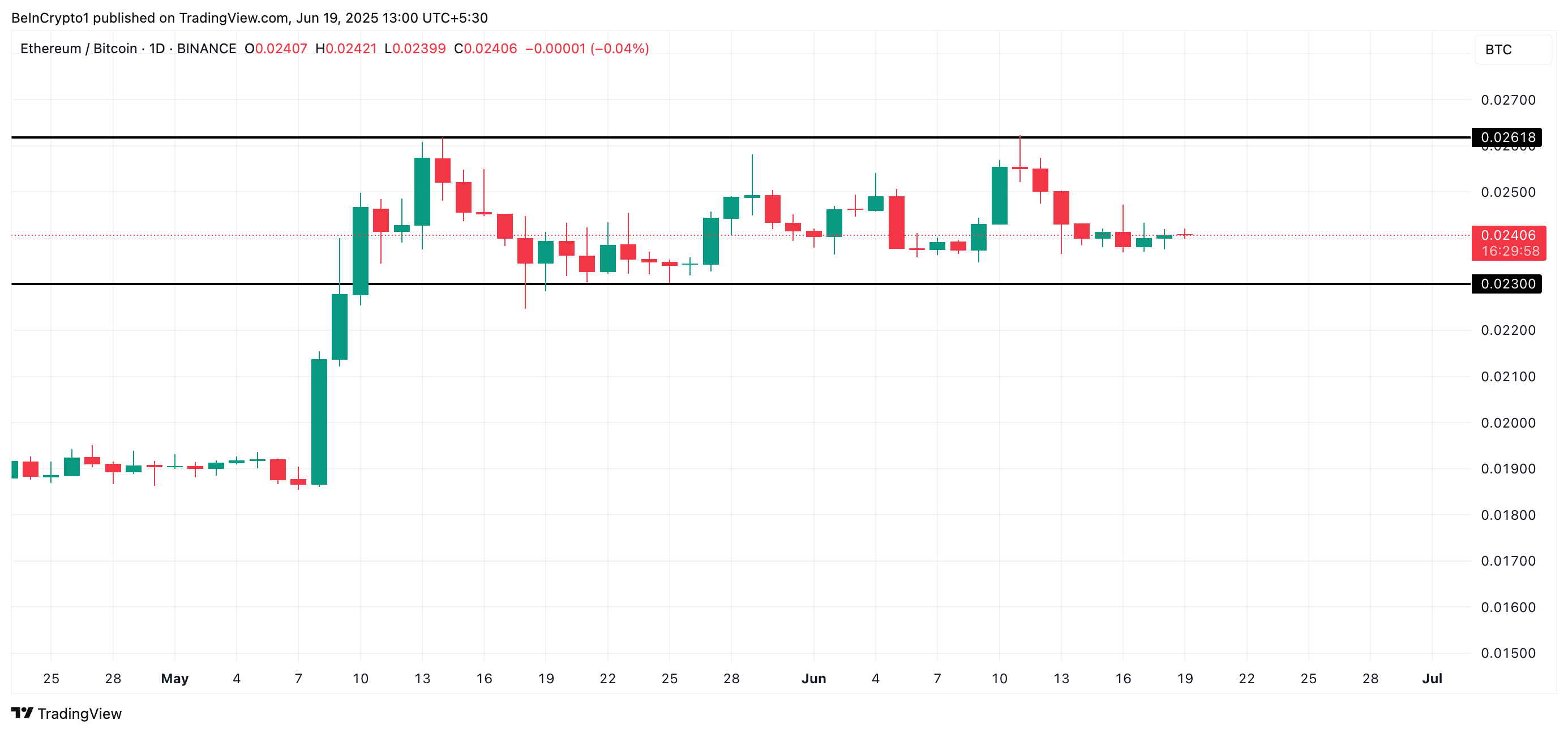 Avlesninger fra det daglige diagrammet viser at ETH/BTC-forholdet har beveget seg innenfor et smalt område siden 13. mai. Det møter motstand på 0,026 mens det finner støtte på 0,023.