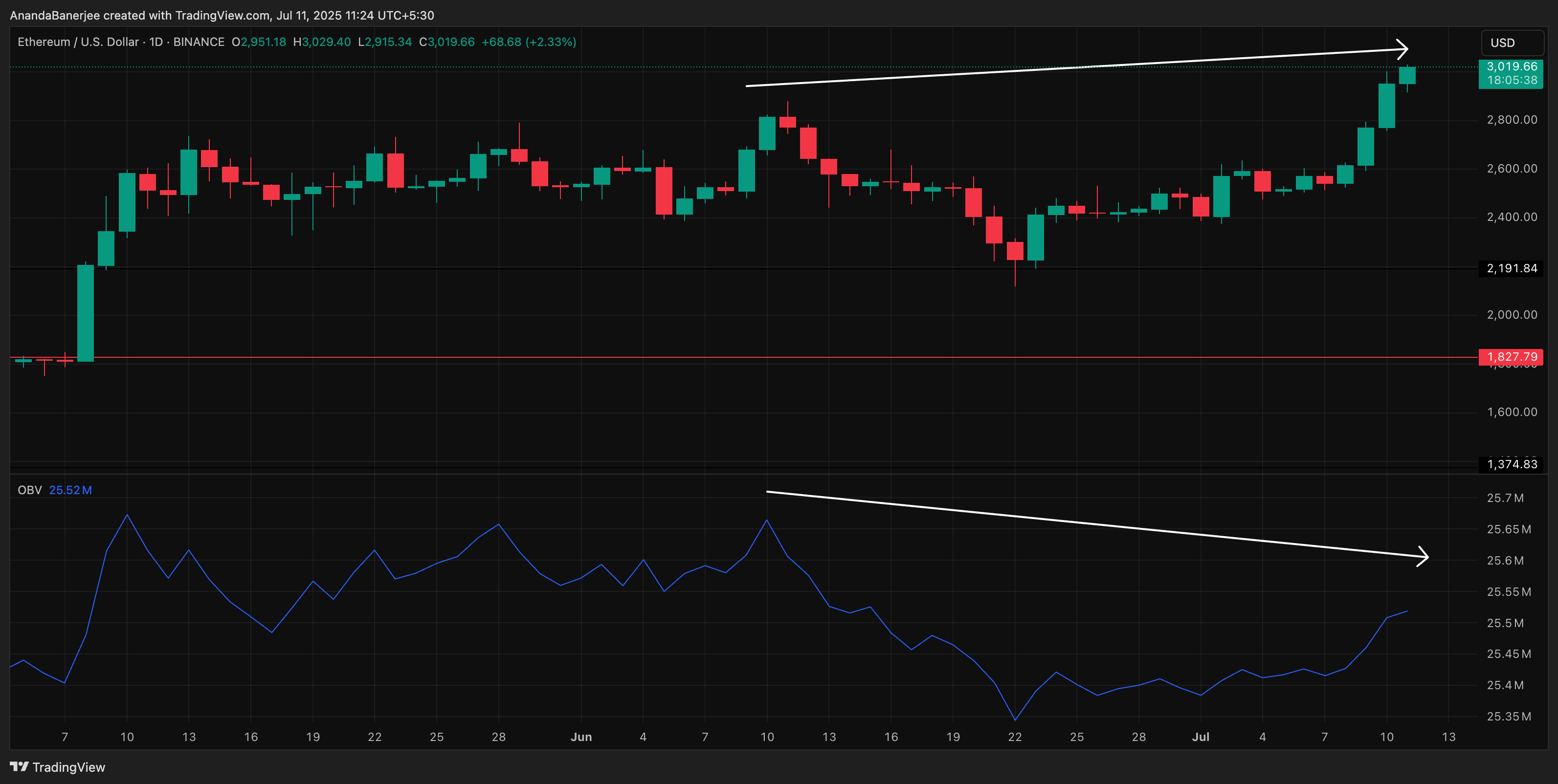 Imidlertid blinker en nøkkelindikator en advarsel. Til tross for at ETHs pris stiger, har On-Balance Volume (OBV) ikke klart å bryte forbi sin forrige topp på $ 2890. Denne divergensen indikerer at volumet ikke fullt ut støtter oppgangen; et klassisk tegn på at momentumet stopper opp.