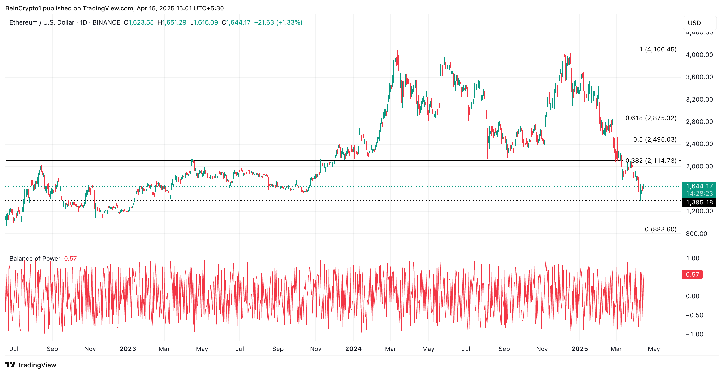 ETHs Balance of Power (BoP) er positiv i skrivende stund, og reflekterer dagens markedsoppgang. Denne indikatoren, som måler kjøps- og salgspress, er i en oppadgående trend på 0,57.