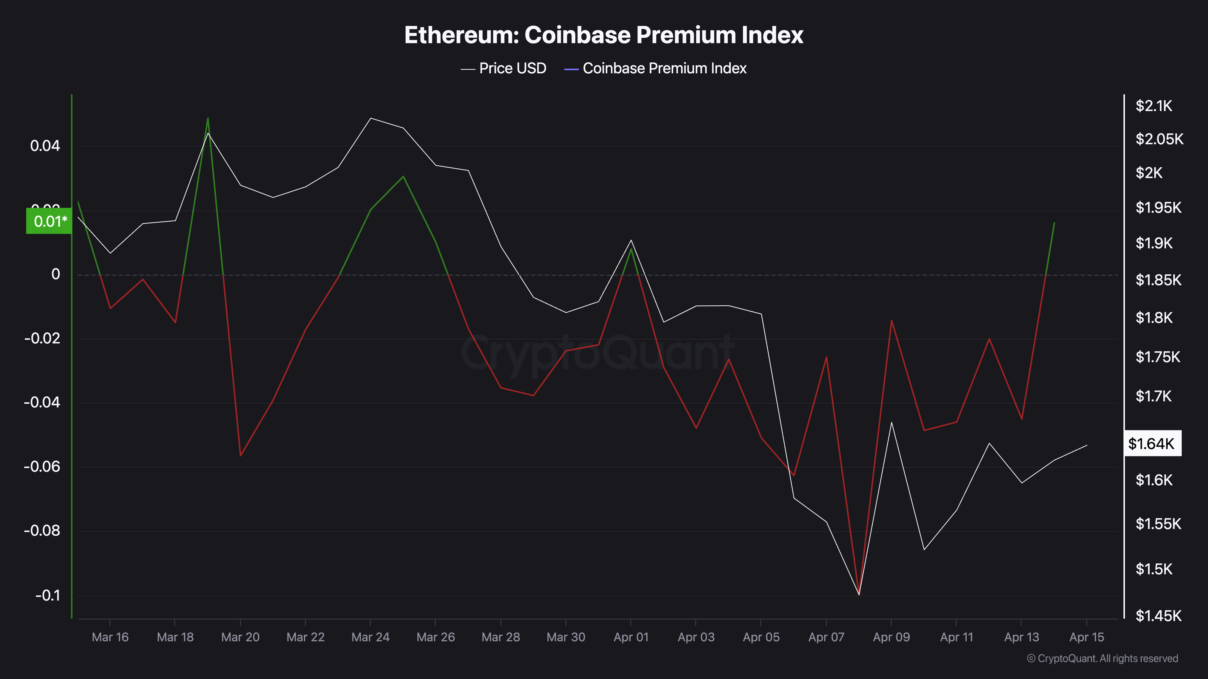 ETHs Coinbase Premium Index måler forskjellen mellom myntens priser på Coinbase og Binance. Når verdien stiger over null, antyder det betydelig kjøpsaktivitet fra amerikanske investorer på Coinbase.