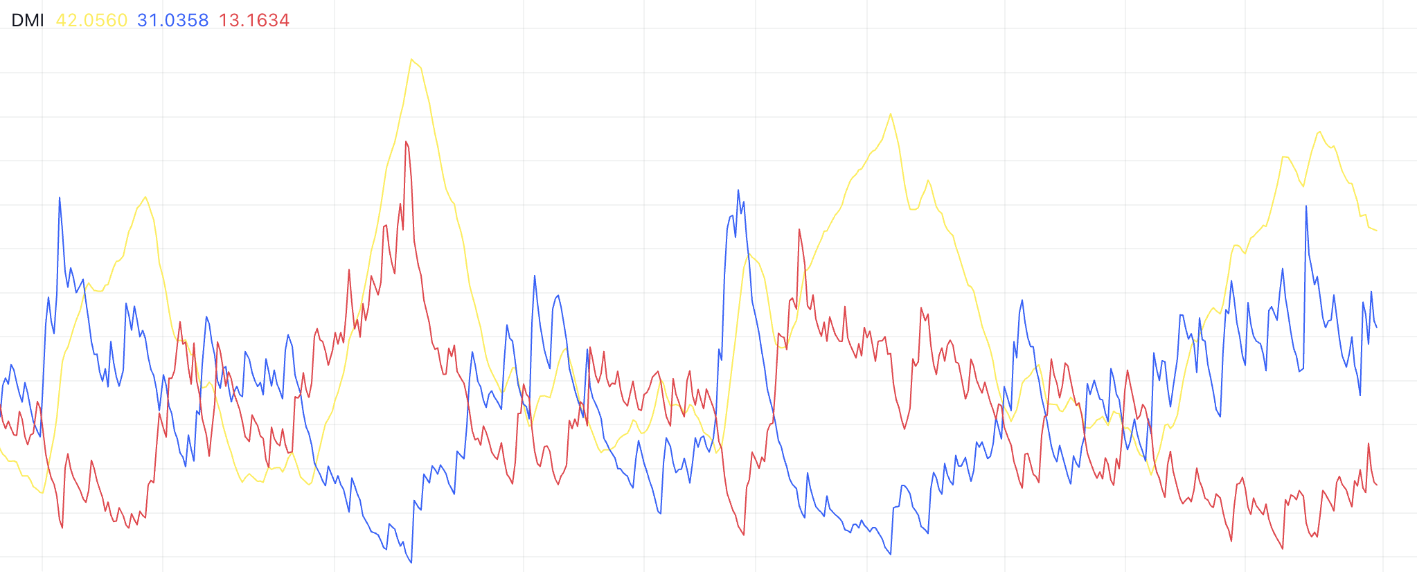 Directional Movement Index (DMI) måler både styrken og retningen på en trend. ADX måler den generelle styrken på trenden, mens +DI- og -DI-linjene representerer størrelsen på henholdsvis bullish og bearish bevegelser. I dette tilfellet reflekterer den høyere +DI et sterkt oppadgående momentum, med oksene fast i kontroll.