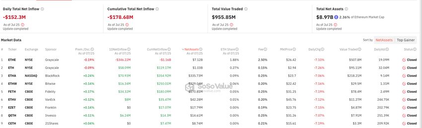 Siden introduksjonen av ETF-ene, har Ethereums pris falt til $ 3,251, et 8 % fall. Samtidig indikerer betydelige nettoutstrømninger fra Ethereum-relaterte finansprodukter, særlig Grayscale Ethereum Trust (ETHE), en bredere mangel på interesse.