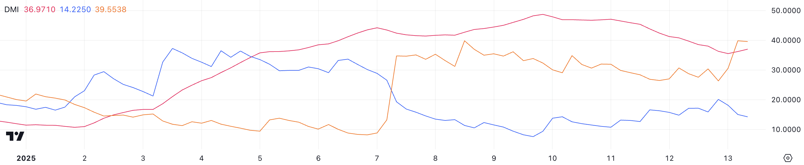 Ethereum Directional Movement Index (DMI) viser at ADX for øyeblikket er på 36,9, en nedgang fra 48 for bare fire dager siden, noe som indikerer en svekkende trendstyrke. Til tross for det, i løpet av denne perioden, har ETH kurs falt omtrent 6 %.
