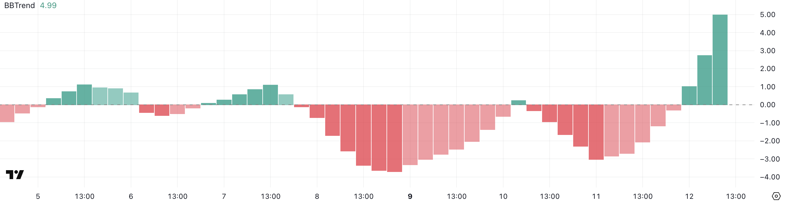Ethereums BBTrend har steget til 4,99, og har steget kraftig de siste timene etter å ha nådd en negativ topp på -3 i går.