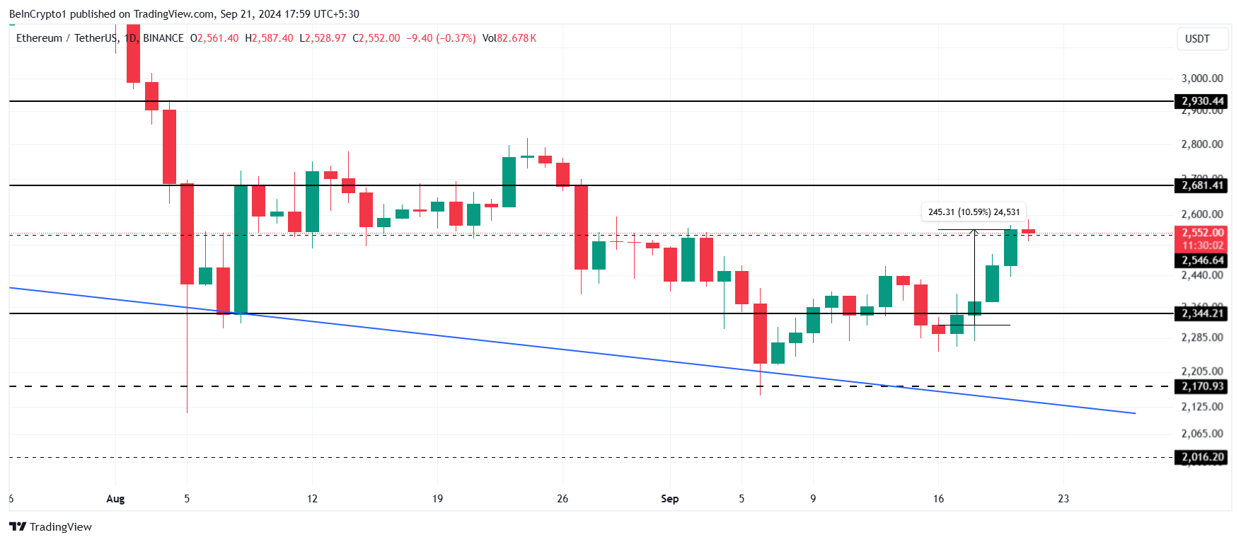 Ethereums pris handles for øyeblikket til $ 2 552 etter en stigning på 10 % de siste dagene. Imidlertid holder ETH knapt over det lokale støttenivået på $ 2 546, noe som gjør den sårbar for en potensiell korreksjon.