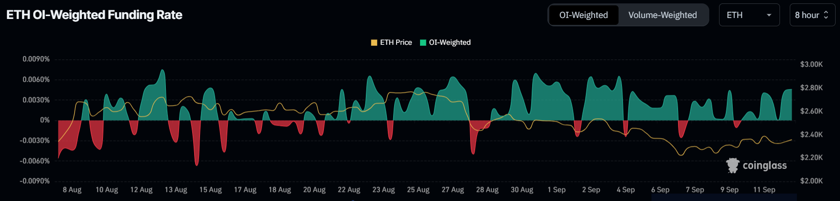 Dette signaliserer at både langsiktige og kortsiktige tradere opplever like gevinster og tap, noe som vanligvis er en indikator på markedets ubesluttsomhet. Nedgangen i MVRV-forskjellen er et tegn på kortsiktig svakhet snarere enn en sterk indikasjon på at Ethereum har nådd et markedsbunn.