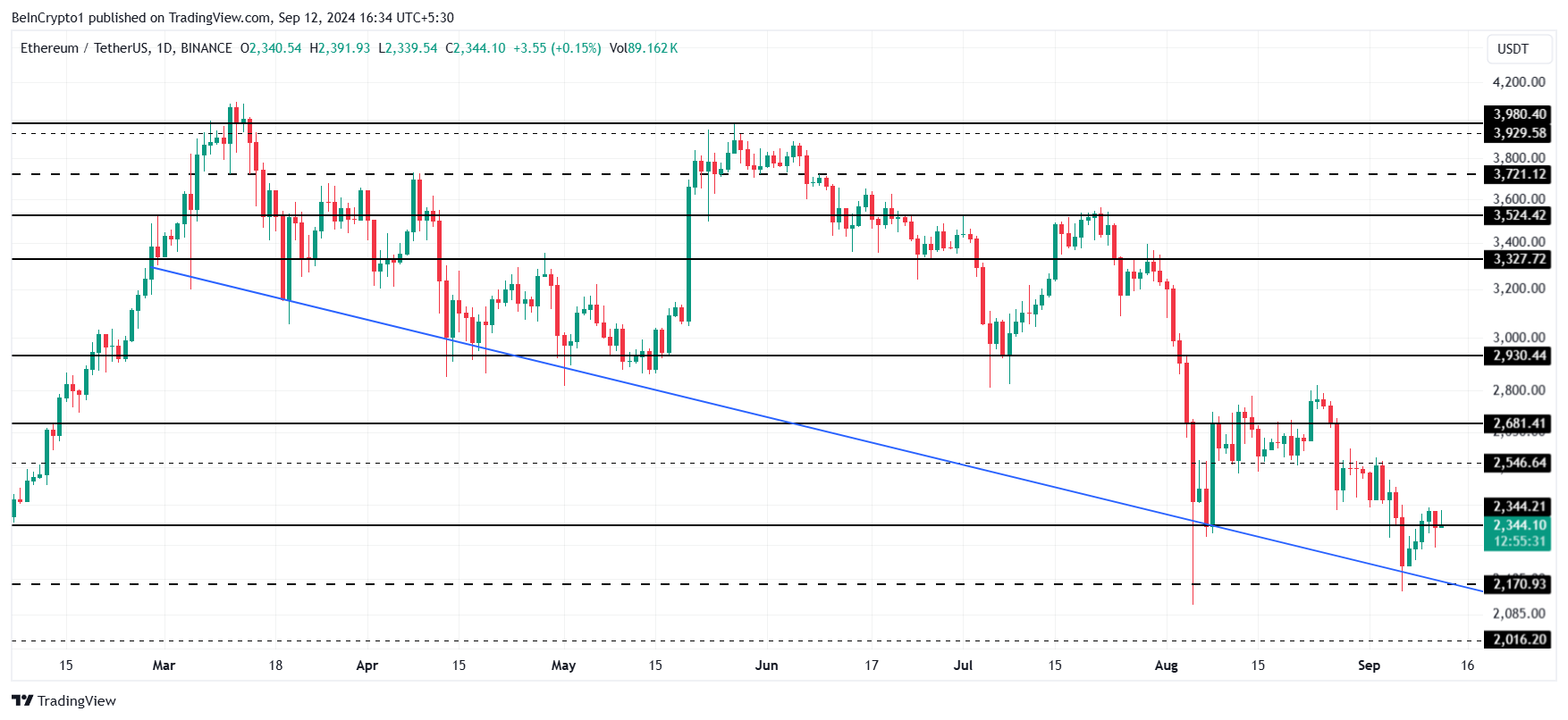 I øyeblikket ser ETH ut til å slutte å teste den nedadgående trendlinjen som støttenivå, noe som kan resultere i sidelengs prisbevegelse. Denne konsolideringsfasen ville gi Ethereum pusterommet som trengs for et potensielt gjennombrudd, slik at altcoin kan gjenvinne sine tidligere høyder over $ 2 681.
