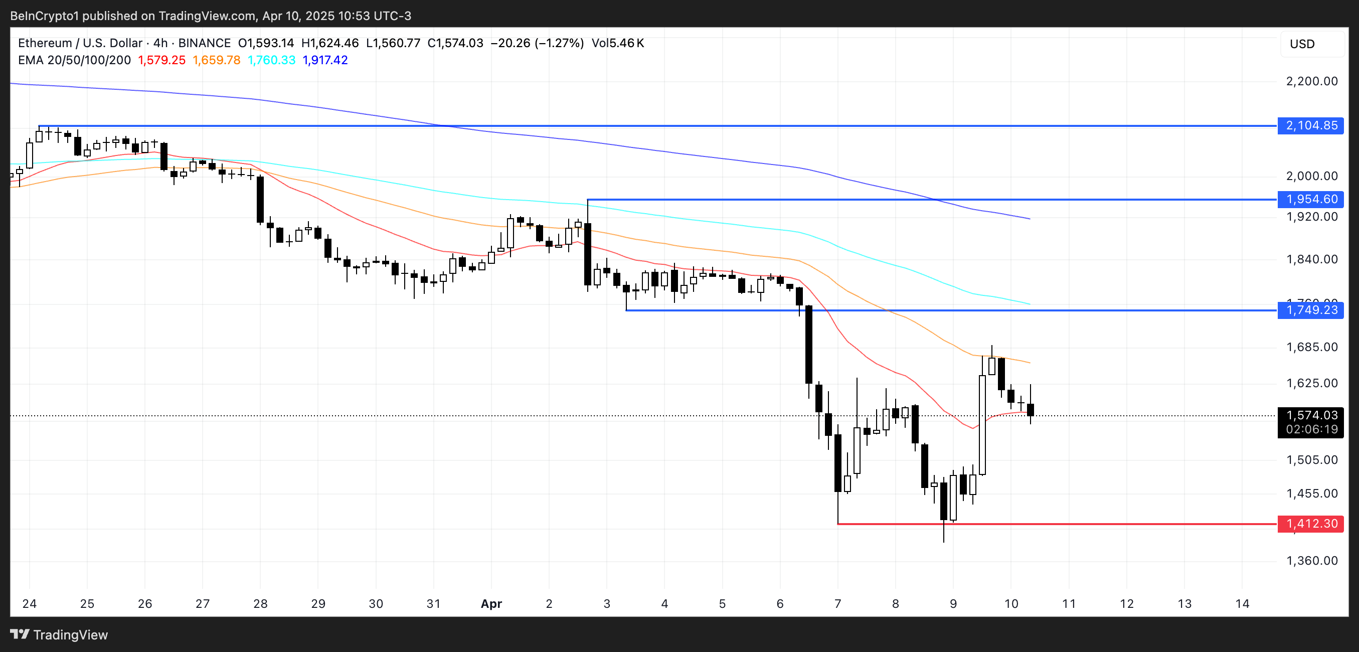 Til tross for Ethereums nylige oppgang etter Trumps tollpause, forblir EMA-strukturen bearish, med kortsiktige glidende gjennomsnitt fortsatt plassert under de langsiktige.