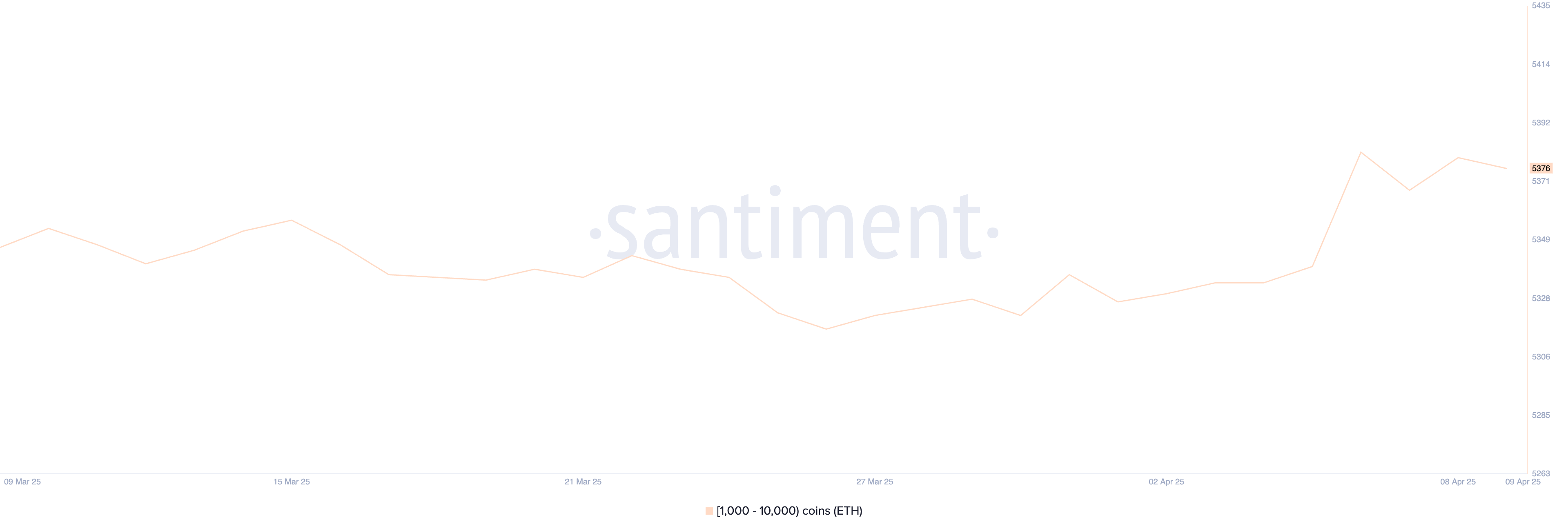 Antallet Ethereum-hvaler—lommebøker som inneholder mellom 1000 og 10 000 ETH—økte fra 5340 til 5382 mellom 5. og 6. april, noe som markerer en kortvarig oppgang i akkumulering.