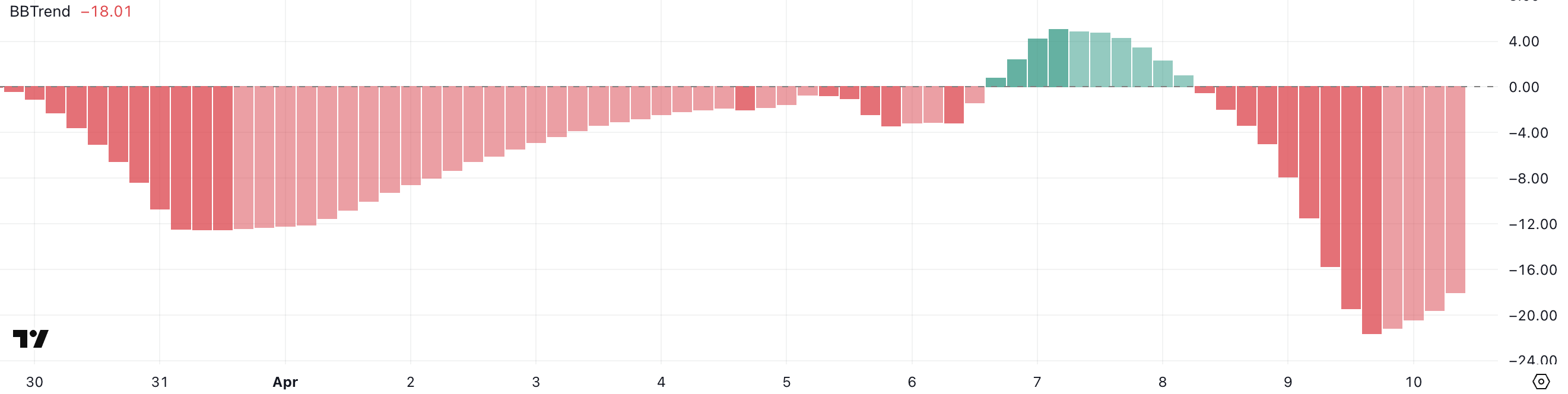 Ethereums BBTrend-indikator har forbedret seg litt, og leser for øyeblikket -18, opp fra -21,59 rett før Trumps tollpause kunngjøring.
