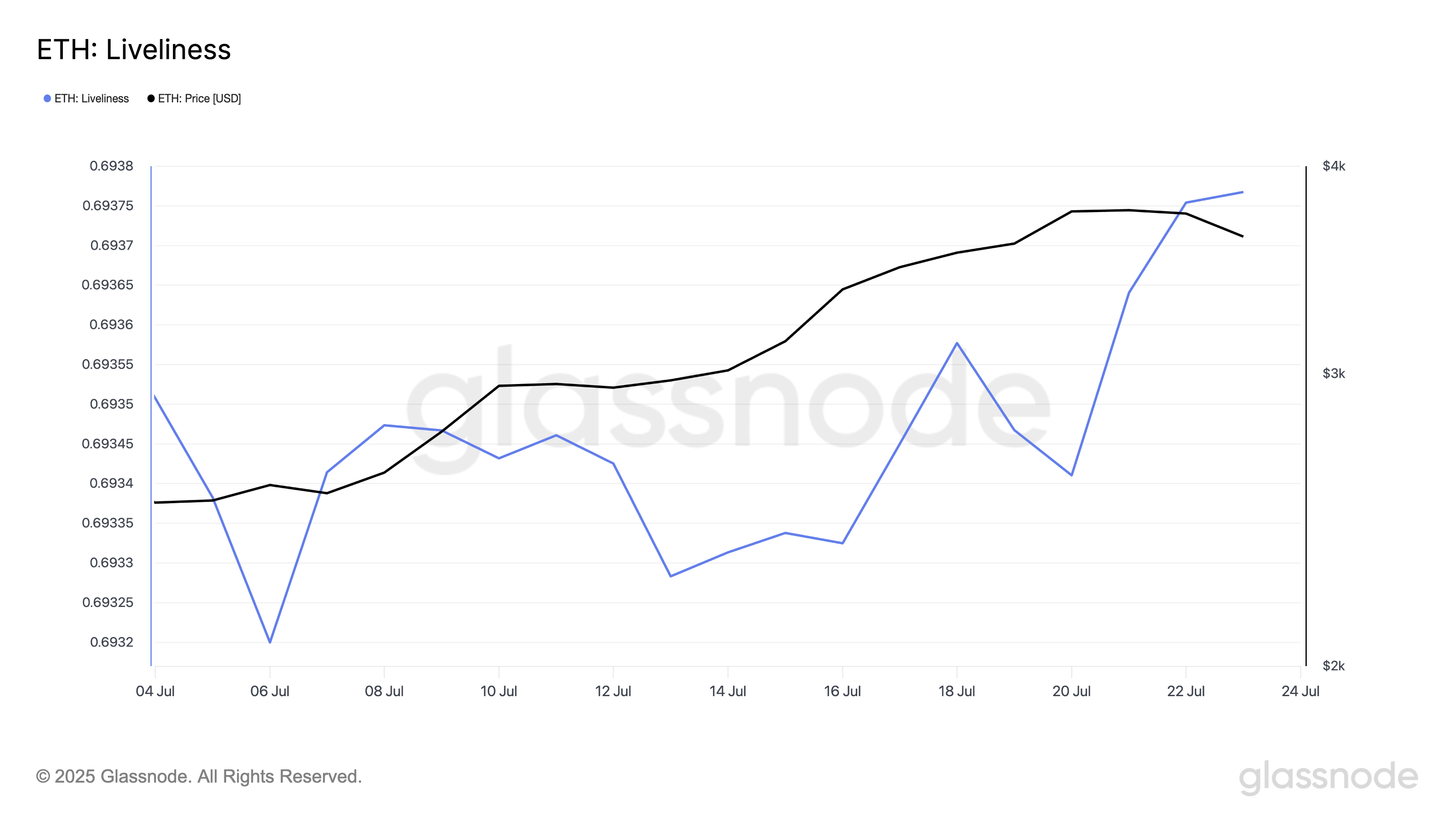 On-chain data viser en økning i ETHs Liveliness, noe som antyder at langsiktige tradere (LTHs), vanligvis de mest motstandsdyktige aktørene i markedet, i økende grad selger sine mynter. I skrivende stund står dette på 0,69.