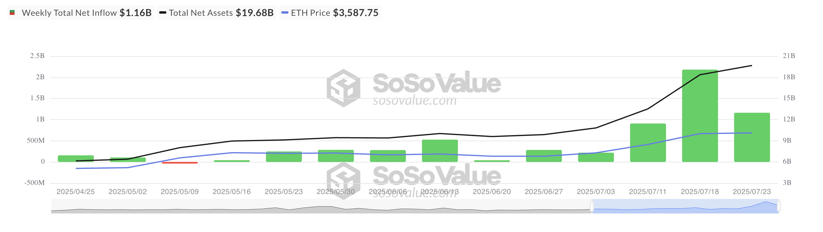 Ethereum (ETH) fortsetter å tiltrekke seg institusjonell interesse til tross for en nylig tilbakegang i pris. Denne uken alene har mer enn $ 1 milliard strømmet inn i ETH-investeringsfond, noe som fremhever den økende institusjonelle appetitten for aktivaet.