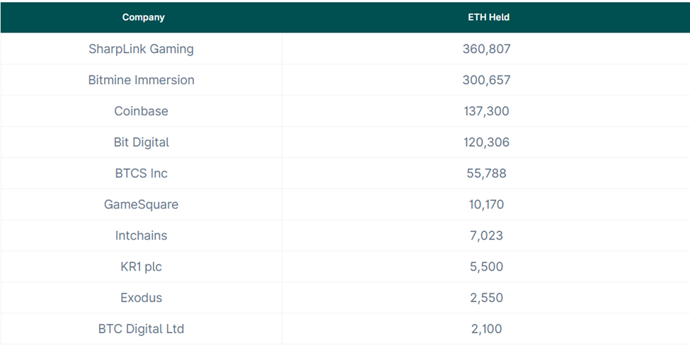 Utenfor topp fem holder selskaper som GameSquare Holdings (10 170 ETH), Intchains Group (7 023 ETH), KR1, Exodus og BTC Digital mindre, men fortsatt strategiske posisjoner.