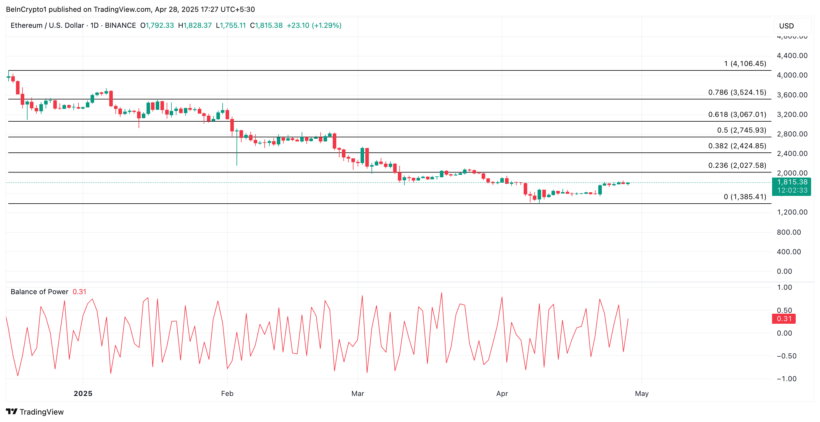 På den tekniske siden fremhever ETHs positive Balance of Power (BoP) gjenoppblomstringen i etterspørselen etter den ledende altcoinen. Denne er for øyeblikket på 0,31.