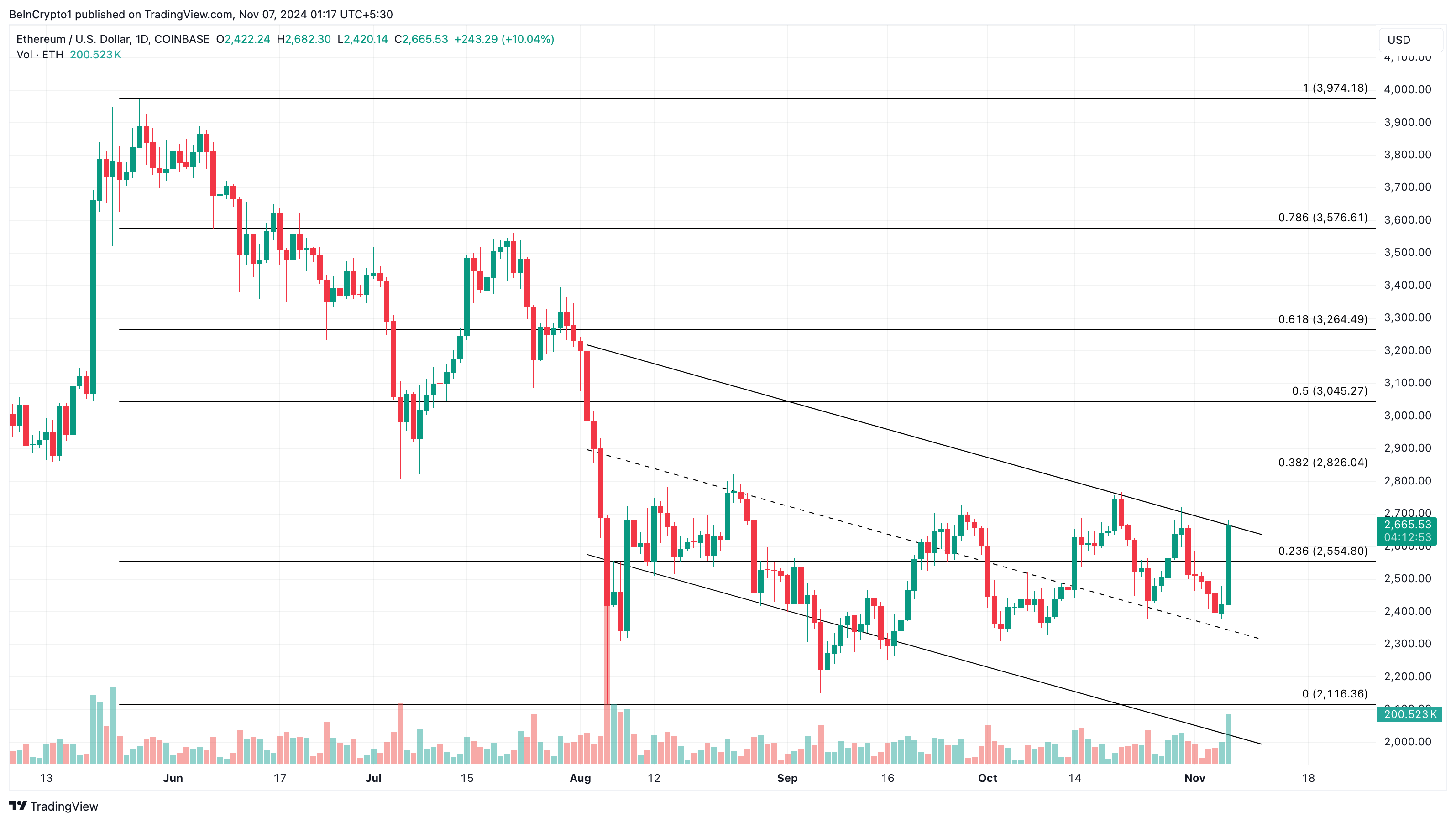 Til tross for Ethreums prisstigning til $ 2 662, er den fortsatt begrenset innenfor en synkende kanal. Denne kanalen er et teknisk mønster som ofte indikerer fortsatt nedadgående press. I denne formasjonen er prisbevegelser vanligvis begrenset mellom to parallelle nedadgående trendlinjer, som representerer potensielle motstands- og støttenivåer.