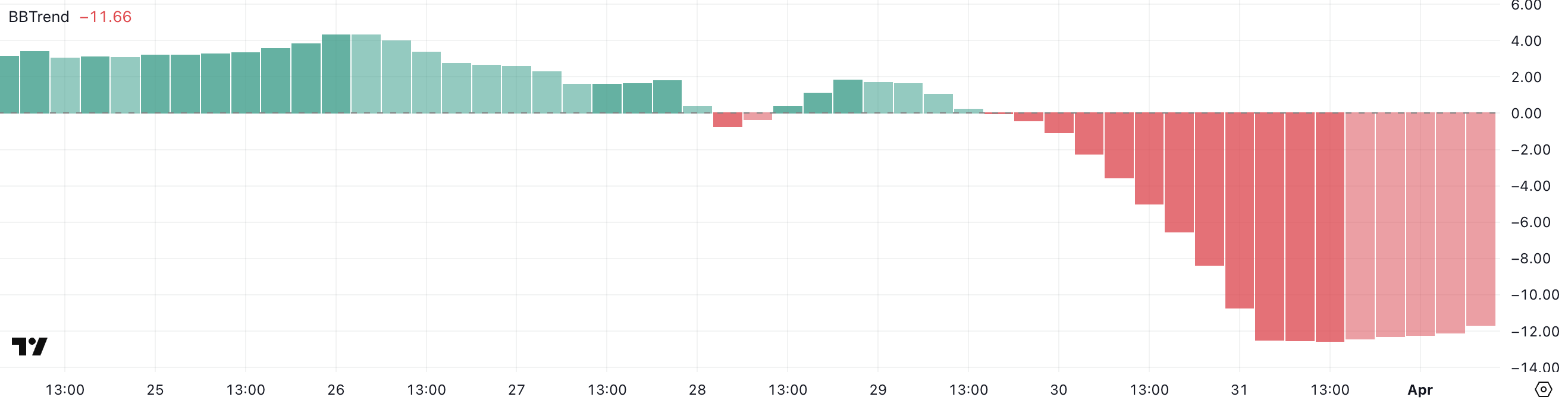 Ethereums BBTrend-indikator leser for øyeblikket -11,66, noe forbedret fra -12,54 dagen før, men fortsatt i negativt territorium for andre dag på rad.