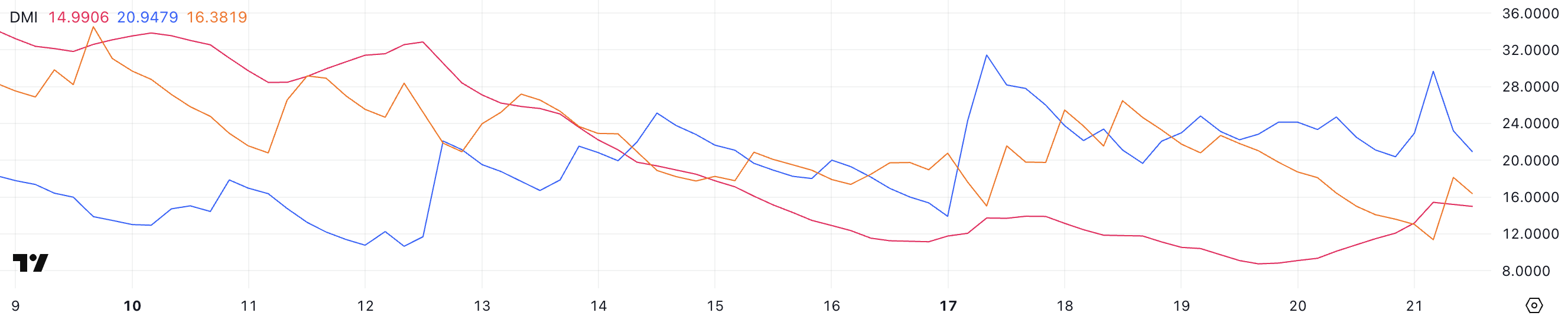 Ethereums Directional Movement Index (DMI) diagram viser at dens Average Directional Index (ADX) for øyeblikket er på 14,9, noe som indikerer en svak trend.