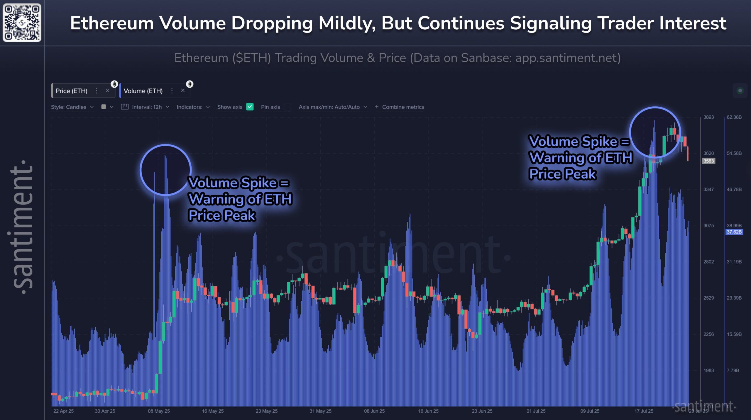 Ethereum sitt handelsvolum øker kraftig, et signal om at private investorer viser fornyet interesse. Selv om Ethereum kurs i forhold til Bitcoin falt med nesten 6 % denne uken, speiler økningen i handelsvolum et mønster sett i mai tidligere i år. En slik økning går ofte forut for en lokal topp, men denne gangen kan det være annerledes.