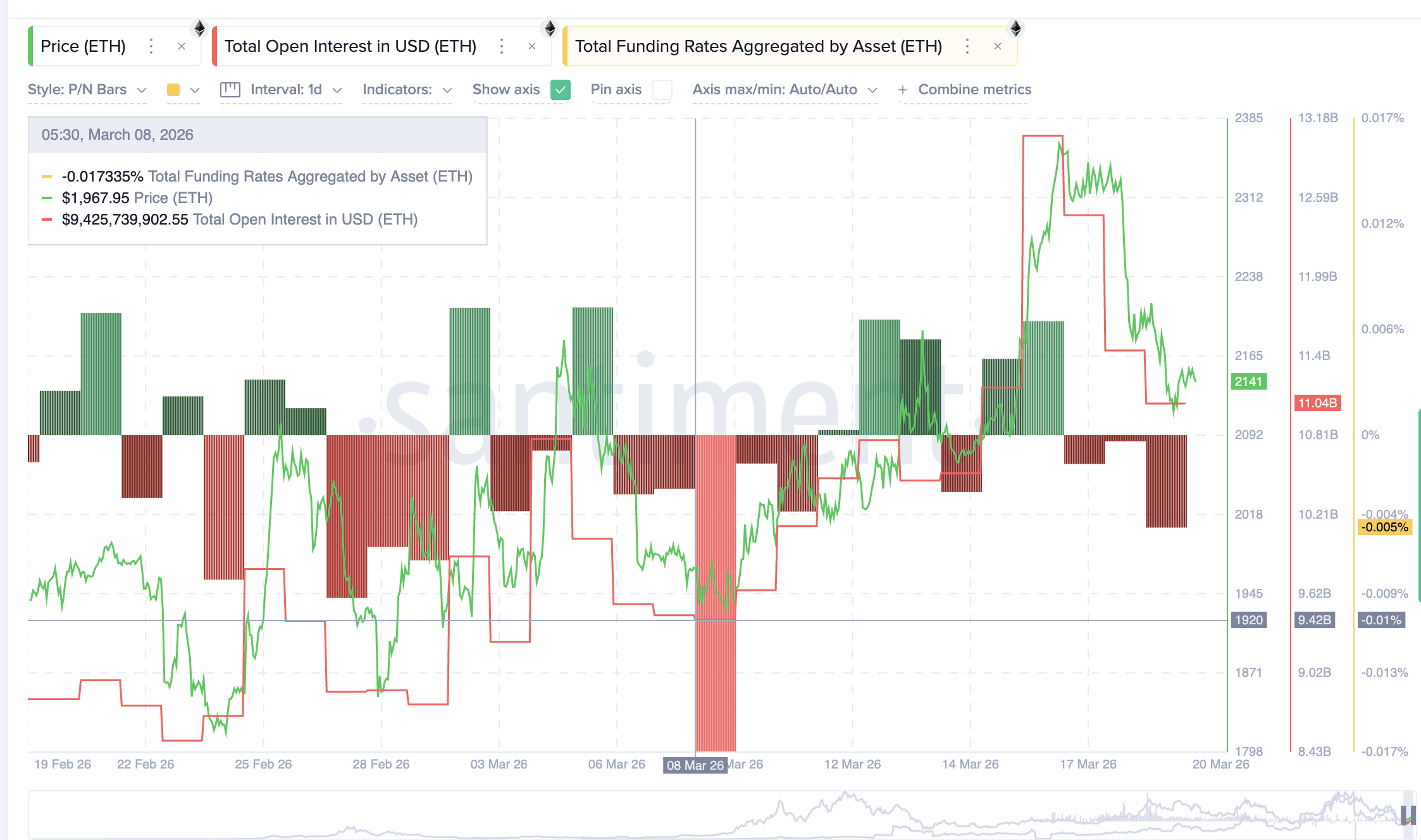 8. mars, da den tidligere relative styrkeindeksen (RSI), en momentumindikator, viste divergens, sto ETHs totale åpen interesse (OI) på $ 9,42 milliarder. Den aggregerte fundingraten var dypt negativ på -0,017 %.