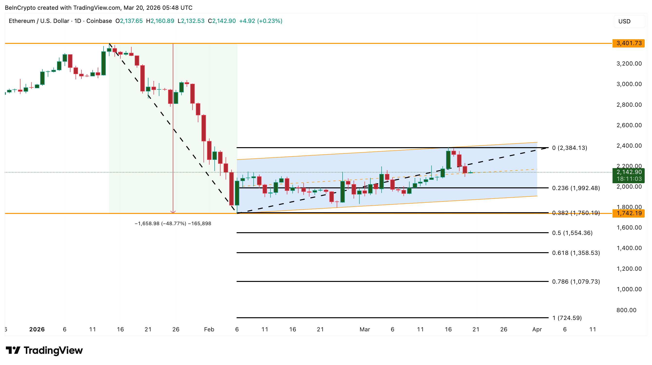 Likevel viser daglig ETH-kursdiagram en stigende kanal som har dannet seg etter 48 % fallet fra $ 3400 til bunnen 6. februar nær $ 1740. ETH forsøkte å bryte over kanalens øvre trendlinje 16. mars, men feilet. Den avvisningen presset kursen tilbake mot midten av området.
