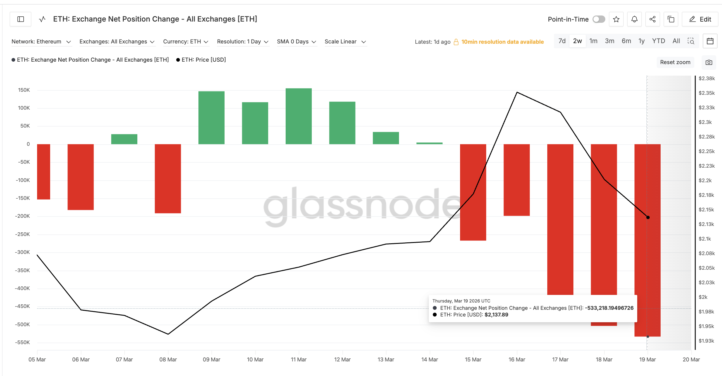 19. mars nådde den samlede nettoposisjonsendringen for ETH over alle børser -533218, ifølge Glassnode. Dette er den største nettoutstrømningen på en enkelt dag på over to uker.