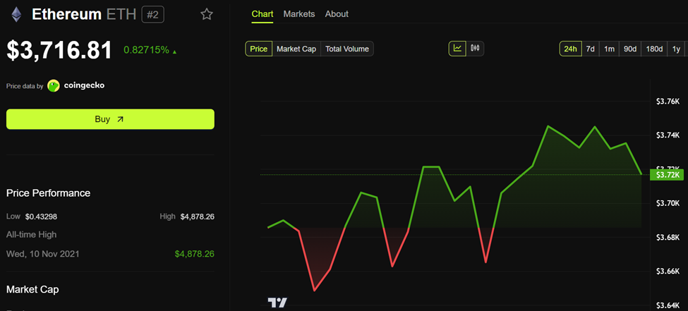 I skrivende stund ble Ethereum handlet for $ 3716, opp med beskjedne 0,82 % de siste 24 timene.
