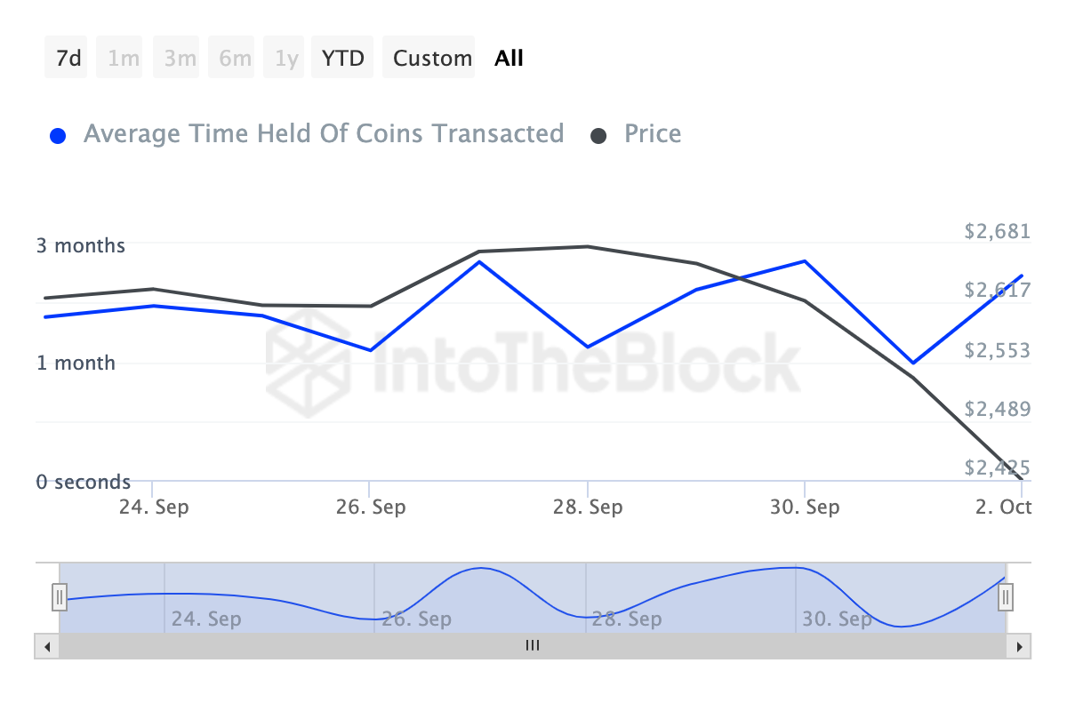 Imidlertid viser nylige data at bordet kan snu, og short-tradere kan være i fare. En nøkkelindikator som forutsier dette er Etereums Coin Holding Time. Denne måler hvor lenge en mynt har blitt holdt uten å bli omsatt eller solgt.