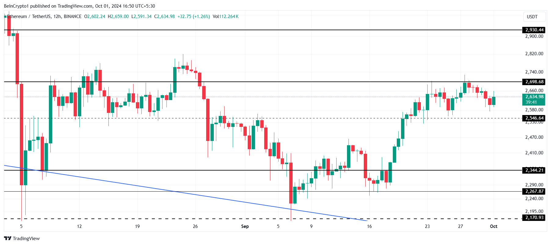Ethereum handles for øyeblikket til $ 2 634, og forblir konsolidert mellom $ 2 698 og $ 2 546. Dette området har vært en kritisk sone for Ethereum, som fungerer som både støtte og motstand de siste ukene. Å bryte ut av dette området er avgjørende for at ETH skal avansere mot $ 3 000.