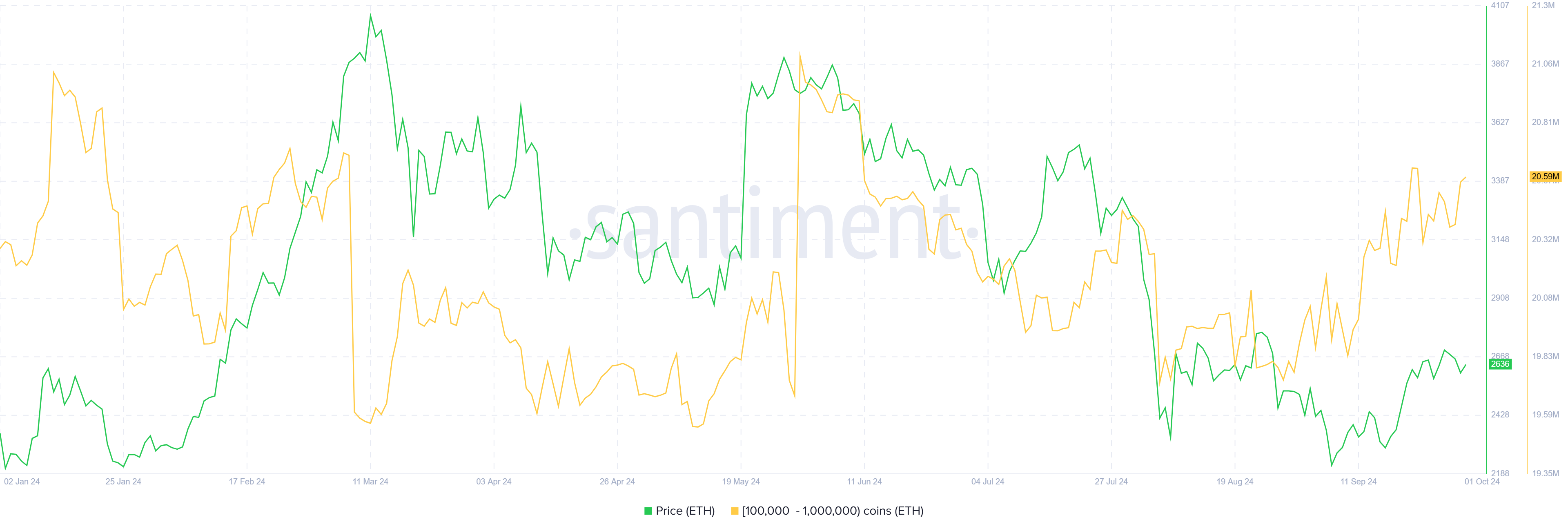Stemningen rundt Ethereum er tydelig bullish, spesielt blant store investorer. I løpet av den siste måneden har adresser som holder mellom 100 000 og 1 million ETH akkumulert over 600 000 ETH, verdsatt til mer enn $ 1,57 milliarder. Denne akkumuleringen har skjøvet deres totale beholdninger til et tre måneders høyt nivå, noe som signaliserer sterk tillit til en potensiell prisøkning.