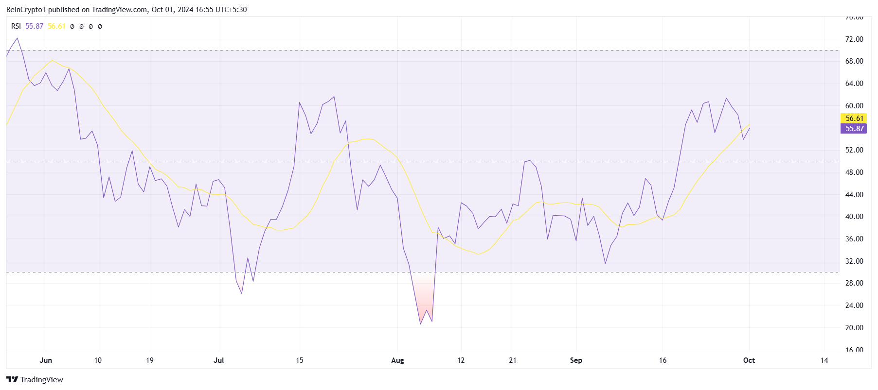 Ethereums makromomentum støtter også muligheten for en oppgang. Relativ styrkeindeks (RSI), en nøkkelteknisk indikator, svever i den bullish sonen, men er langt fra overkjøpt territorium. Dette antyder at selv om ETH opplever positivt momentum, er det fortsatt rom for ytterligere vekst uten å utløse en korreksjon.