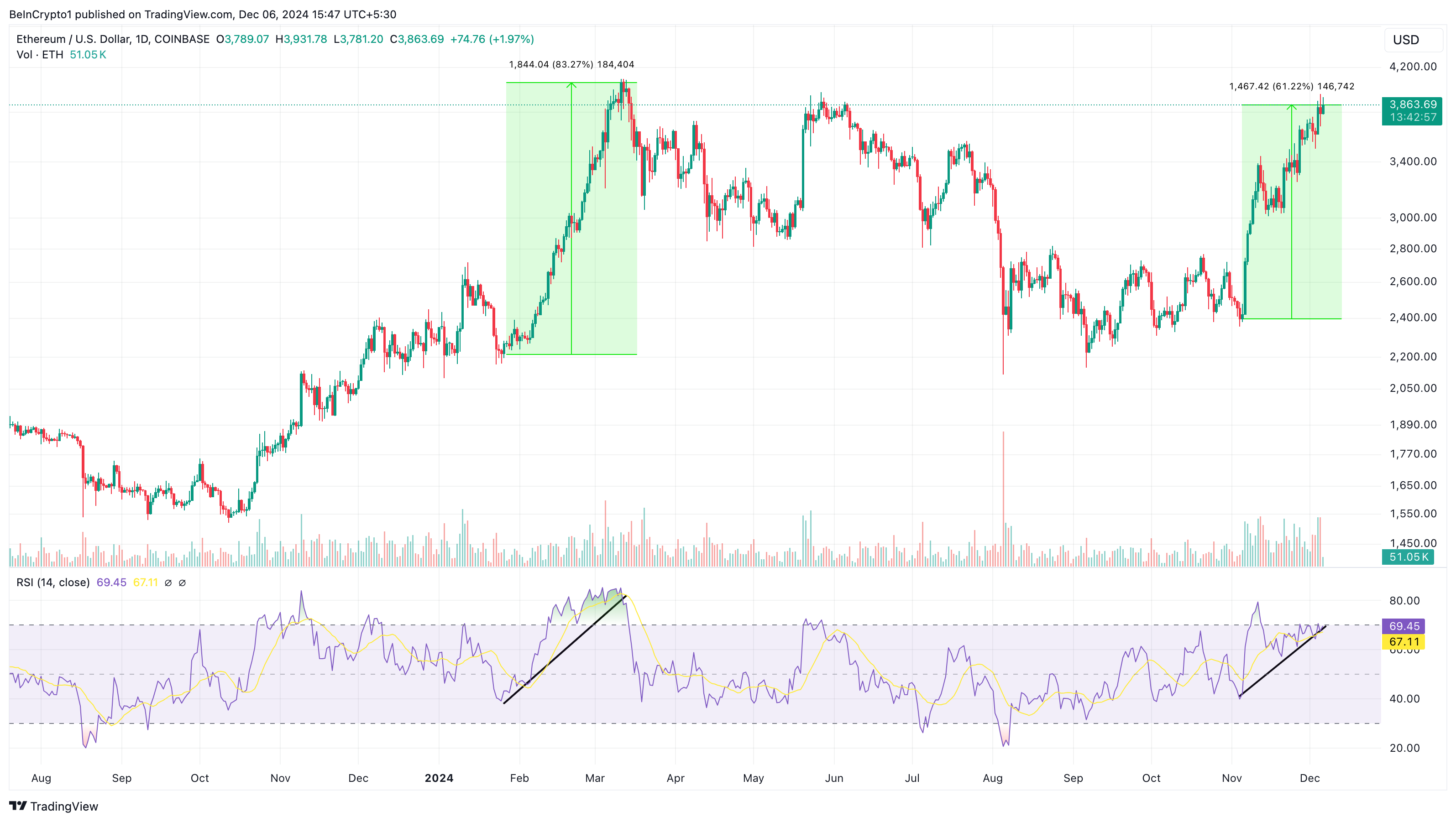 En evaluering av den daglige ETH/USD-grafen viser at kryptovalutaen følger en lignende trend, som så den nå en årlig topp i juni. I løpet av den perioden falt Ethereums pris først fra $ 2770 til $ 2200 før den klatret over $ 4000 måneder senere.