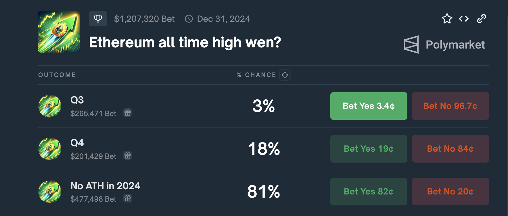 Ifølge data fra Polymarket tror 3 % av traderne at ETHs pris vil nå sin ATH før slutten av dette tredje kvartalet.