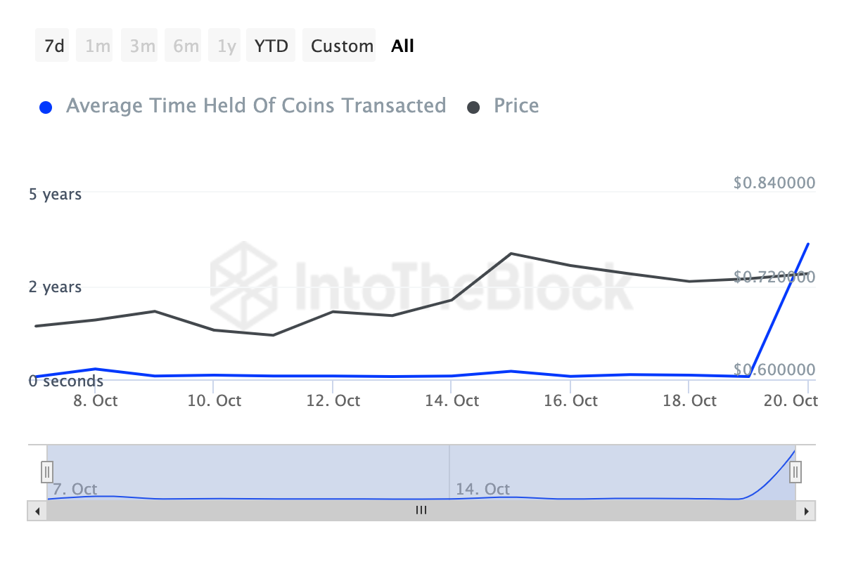 Men, krypto hvaler er ikke de eneste som uttrykker et bullish utsyn. En analyse av myntens holdetid viser en betydelig økning de siste syv dagene. Holdetid refererer til varigheten en mynt holdes uten å bli omsatt eller solgt.