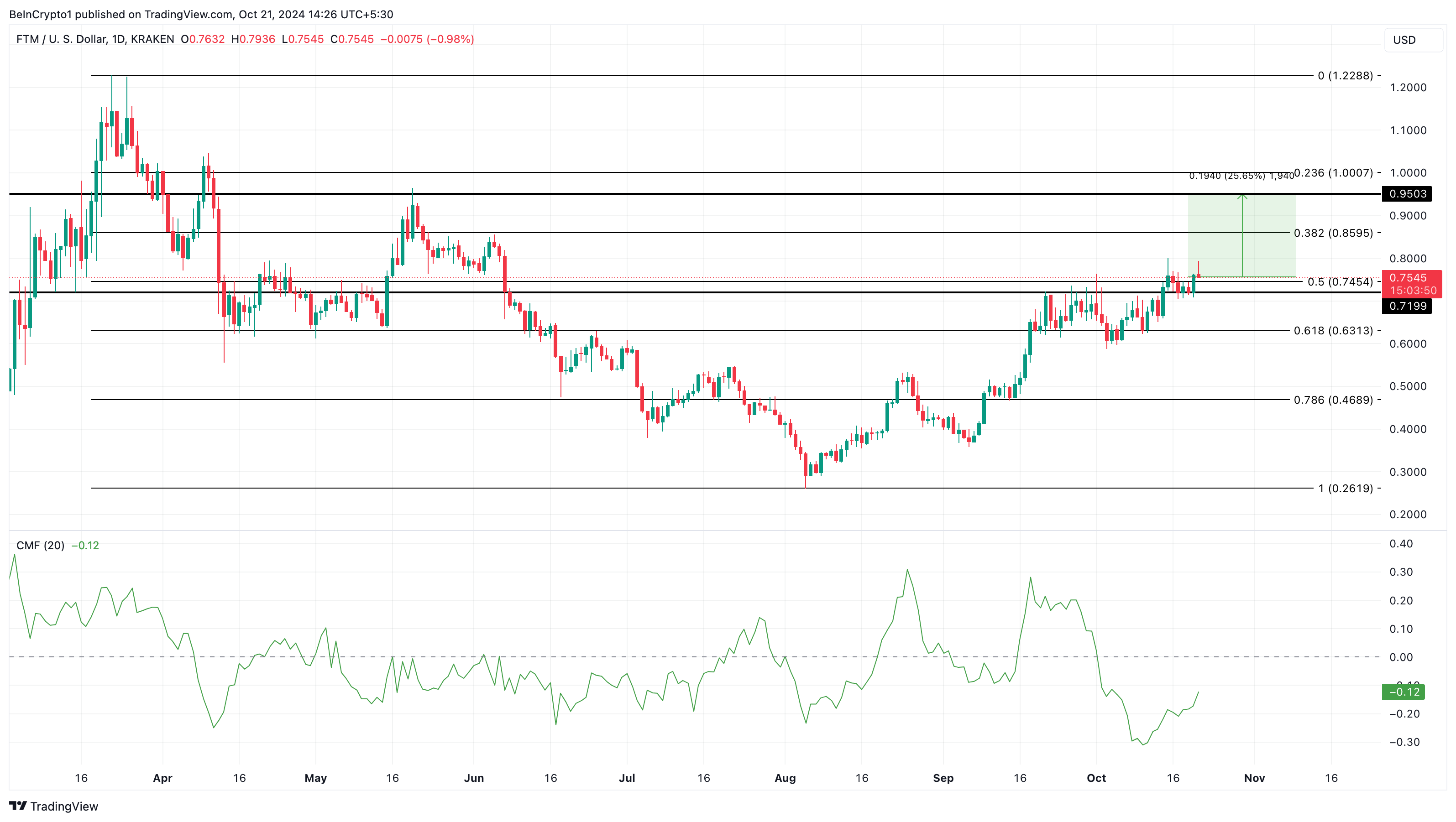 Hvis denne trenden holder seg, kan FTM klatre med 25 %, og nå $ 0,95 på kort sikt. Men hvis prisen faller under støttenivået på $ 0,70, kan det utløse en dypere korreksjon ned til $ 0,63.
