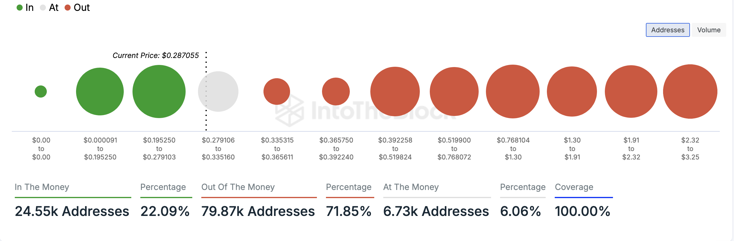 For øyeblikket er 80 000 lommebokadresser, som utgjør 72 % av alle dens innehavere, “ute av pengene.” Ifølge IntoTheBlock anses en adresse som ute av pengene hvis gjeldende markedspris på en eiendel er lavere enn gjennomsnittskostnaden som adressen kjøpte (eller mottok) tokenene den nå holder.