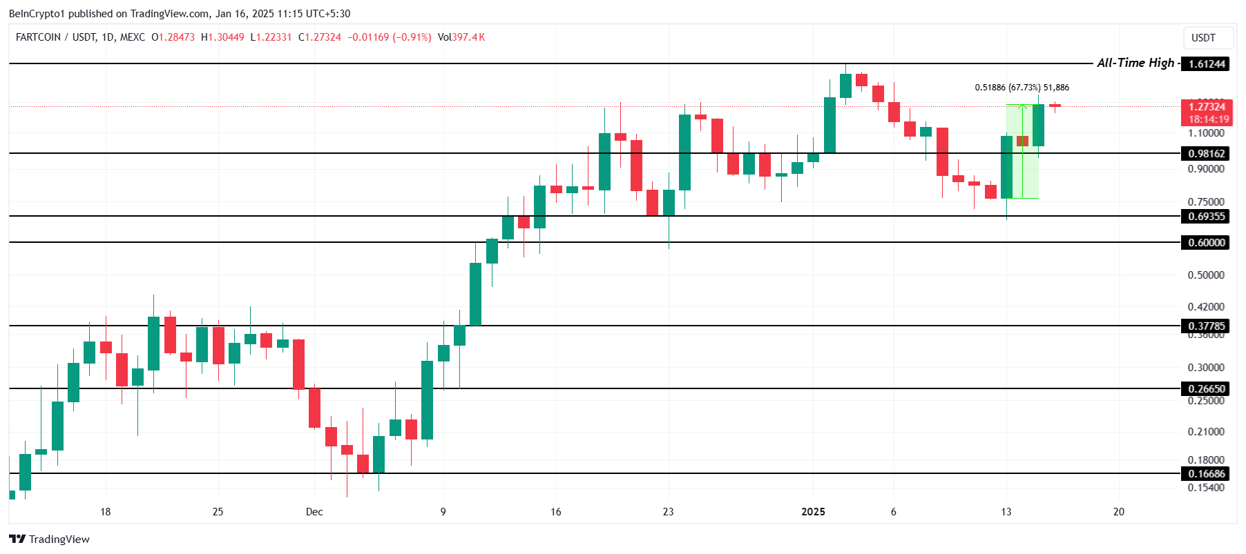FARTCOIN har økt med 67 % de siste tre dagene, og bringer den nåværende prisen til $ 1,27. Dette plasserer meme coinen litt over 30 % unna å overgå sin ATH på $ 1,61. Å oppnå denne milepælen vil kreve jevn etterspørsel og positiv stemning.