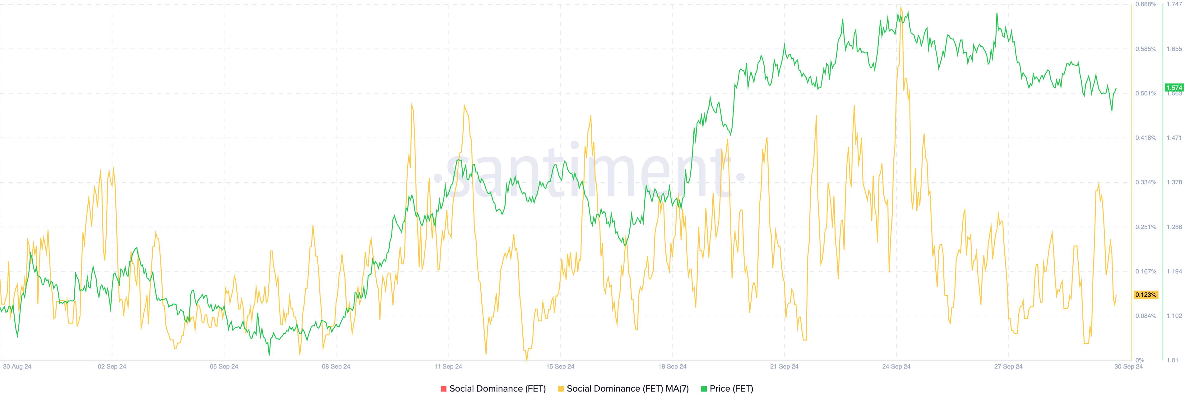 FETs sosiale dominans 7-dagers glidende gjennomsnitt har sett en markant nedgang, og falt til 0,123 %, ned fra 0,336 % bare en dag tidligere og 0,668 % den 24. september. Denne nedgangen er viktig fordi sosial dominans måler nivået av oppmerksomhet og diskusjon en mynt mottar i forhold til det totale markedet.