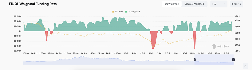 Det er viktig å merke seg at en økning i en eiendels derivathandelsvolum ofte indikerer markedssentiment. For eksempel, hvis det meste av handelsvolum består av lange posisjoner, kan det signalisere bullish sentiment. Dette er tilfellet for FIL, som hentet fra finansieringsrenten, som har holdt seg positiv siden 13.