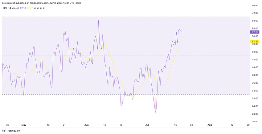 FILs stigende Relative Strength Index (RSI) bekrefter den vedvarende økningen i FILs etterspørsel til tross for den nylige prisnedgangen. Når dette skrives, er indikatorens verdi 62,18.