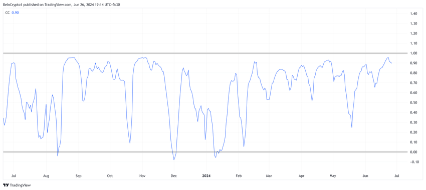 Med Bitcoin i en bearish fase, viser Filecoins høye korrelasjon med BTC seg å være en ulempe. Investorer er nå mer forsiktige, gitt potensialet for ytterligere nedgang påvirket av Bitcoins ytelse.