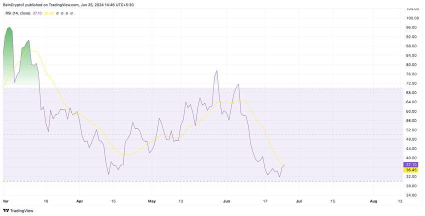For øyeblikket handler FLOKI til $0,00016. Med mange innehavere som ønsker å bokføre gevinster, har meme-mynten vært under betydelig salgspress de siste ukene. Avlesninger fra Relative Strength Index (RSI) bekrefter dette.