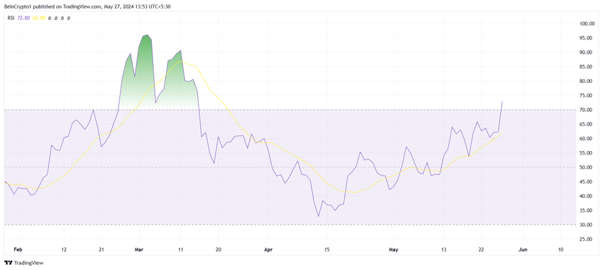 I skrivende stund har mememynten allerede gått inn i den overkjøpte sonen over 70,0. Denne sonen er synonymt med korreksjoner, og forrige gang FLOKI gikk inn i denne sonen var ved 2024-høyden.