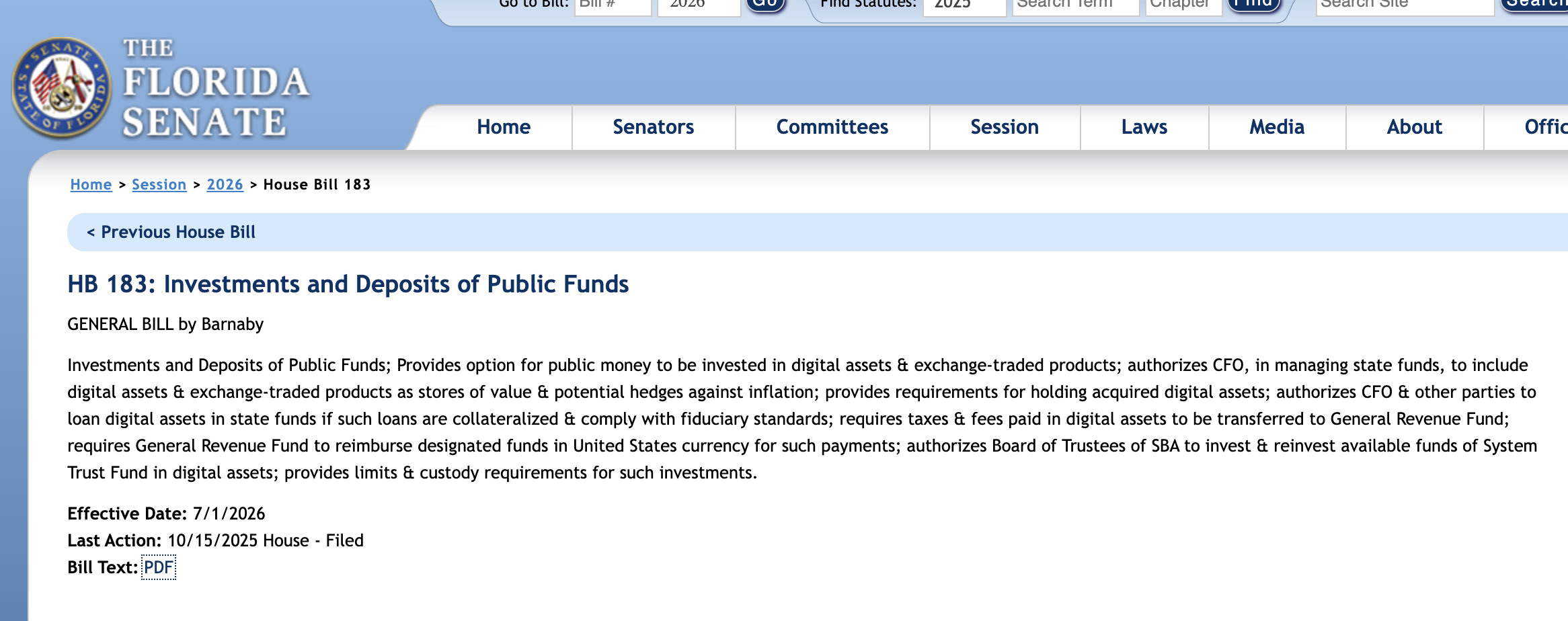 Forslaget, innlevert 15. oktober, kan gjøre Florida til en av de første amerikanske statene som forvalter digitale aktiva som en del av sine offentlige reserver.