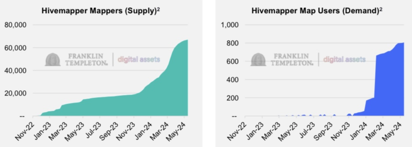 Et fremtredende eksempel er Hivemapper, fremhevet av Franklin Templeton som verdens første blockchain-baserte desentraliserte kartleggingsnettverk. Drivere installerer et dashcam, bidrar til veikartlegging og tjener Hivemapper (HONEY) tokens. Imponerende nok har Hivemapper kartlagt 21% av globale veier på 31 måneder, og økt bidragsyterbasen til over 60,000.