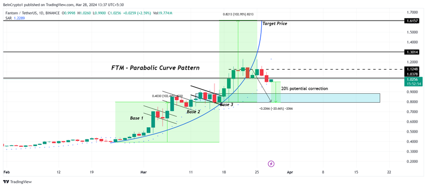 Fantom-prisen, som observerte et parabolsk kurvemønster, var forventet å observere en korreksjon snart. I henhold til mønsteret var en nedgang på 31% sannsynlig, som spådd av BeInCrypto, som er veien som FTM valgte.