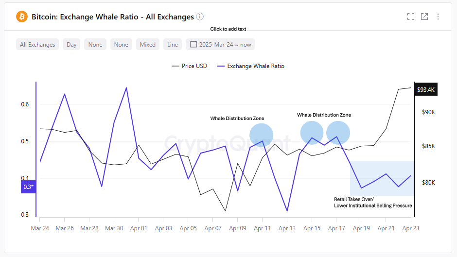 Exchange Whale Ratio, som falt under 0,3 den 23. april, indikerer et stort skifte i deltakelse, fra institusjonelle eller store tradere til mer detaljhandelsdominerte strømmer.
