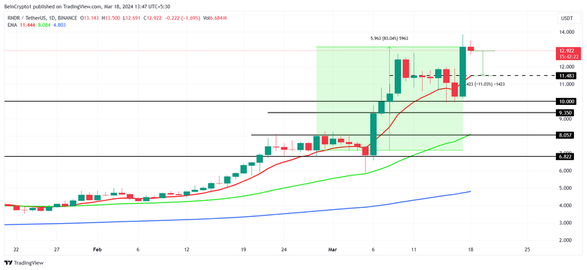 Renderprisen, som i skrivende stund handles til $ 12.92, er litt under all-time high. Markedsforholdene antyder imidlertid at RNDR kan avta ytterligere. Altcoin har stor sjanse for å falle til $ 11.50, noe som utvider korreksjonene på 11% og sender kryptoaktiva til $ 10.
