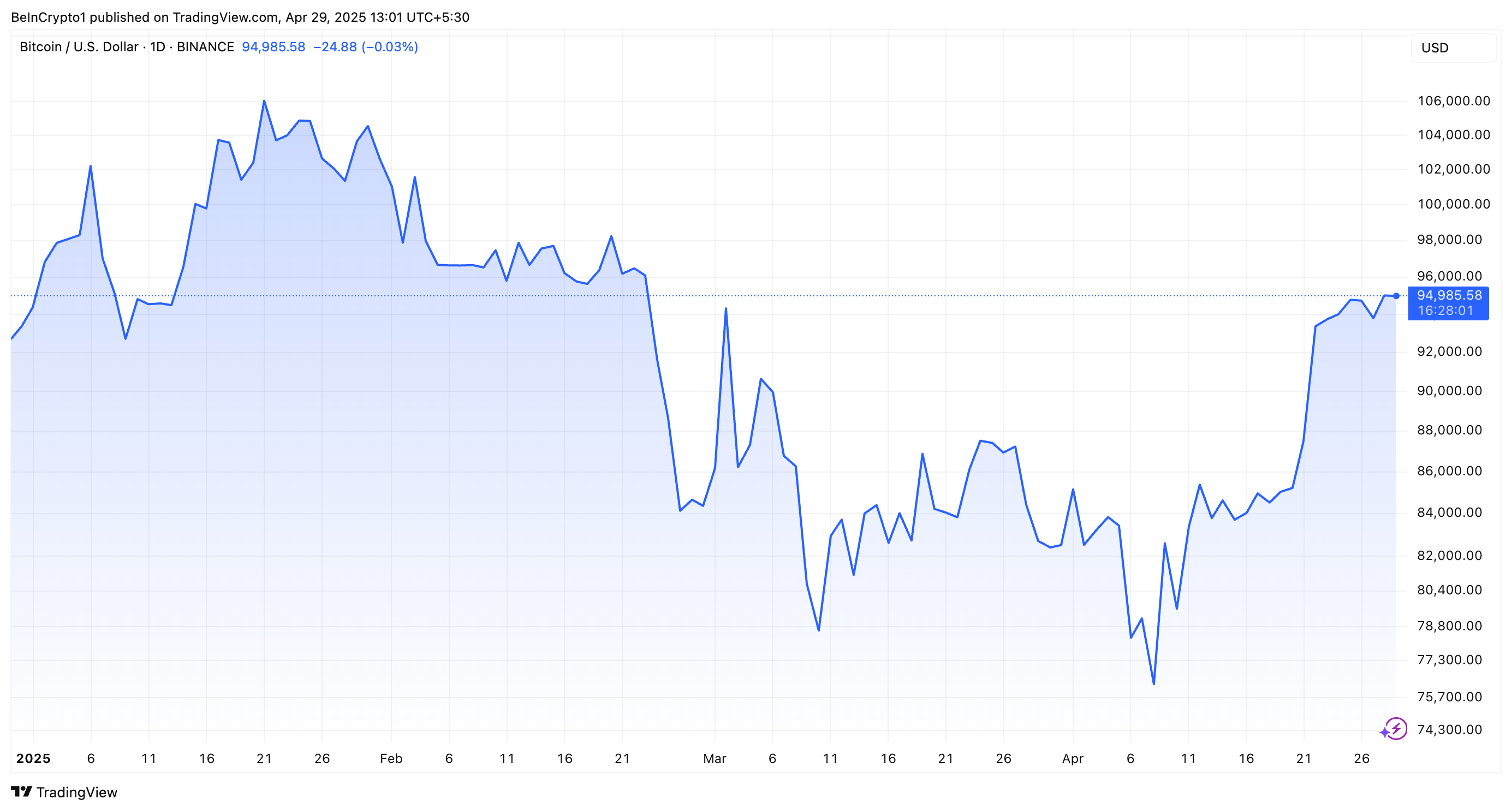 Denne effekten er allerede ganske synlig ettersom BTCs verdi har kommet seg opp igjen midt i en fallende dollar. I løpet av den siste uken har den økt med 7,5 %. I skrivende stund ble BTC handlet til $ 94 985.